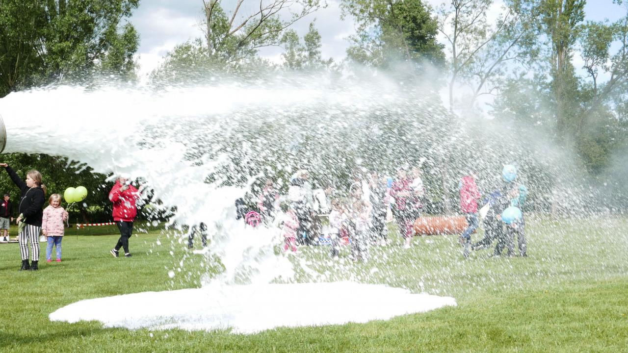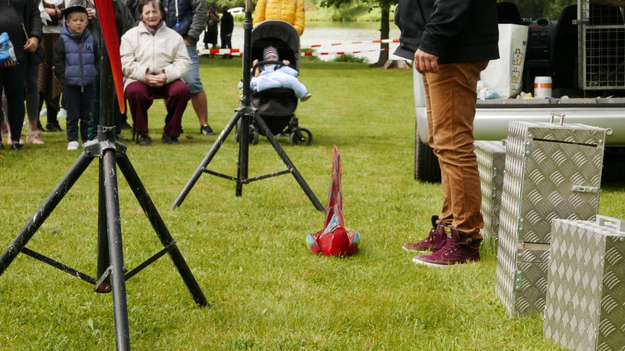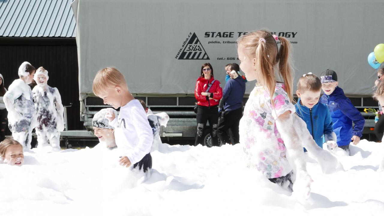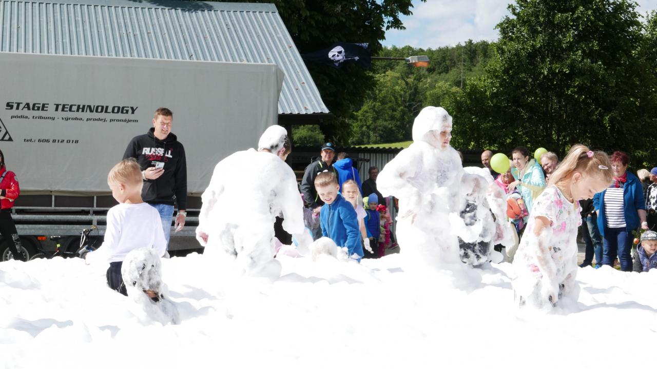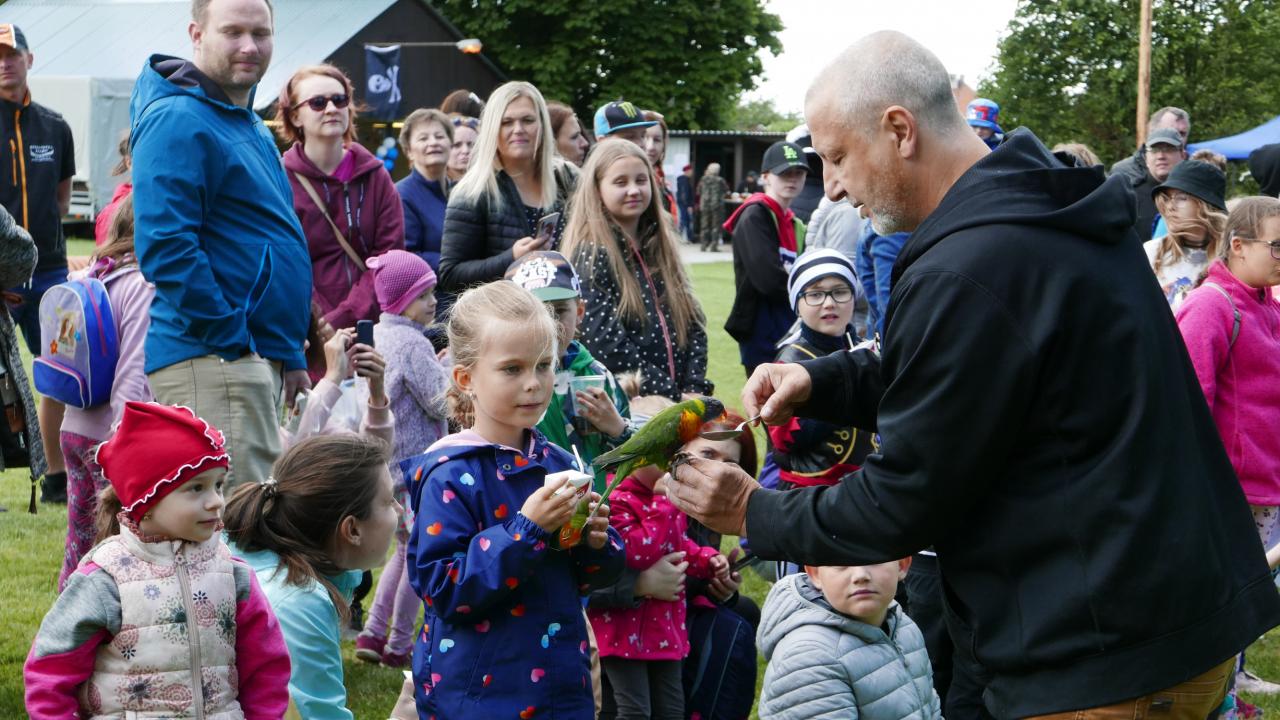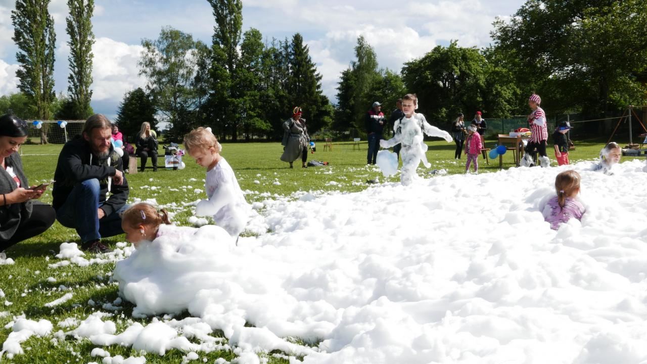 Pro zpestření, a to doslova, nás přijel navštívit pan Jindřich Papoušek se svými papoušky. Bylo jich celkem 9 ve stáří od 3 měsíců po 13 let. Pokaždé, když pan Papoušek vytáhl dalšího papouška z klícky, ozvalo se sborové: „Jéééé!“ Každý papoušek byl totiž jiný, respektive jinak barevný, ale všichni byli krásní a dětem se moc líbili. Dozvěděli jsme se, že papoušci, když se zamilují, tak na celý život, když je jim smutno, tak se dokážou tak oškubat, že vypadají jako kuře v supermarketu, a když se nudí, tak toho dokážou hodně zničit. Jsou ale také velice šikovní, což nám názorně předvedli. Jeden zamával křídly, ale jen když ho jedno z dětí poprosilo, ležel na zádech nebo dokonce válel sudy. Další ukázal, jak umí způsobně jíst ze lžičky, další předvedl živou kravatu a další dva papoušci akrobati se udrželi na jedné obruči, i když s ní pan Papoušek točil. Všichni papoušci byli na volno a žádný neuletěl. Prý jsou vždycky rádi, když mají možnost se zúčastnit nějaké akce jako třeba dětského dne, alespoň se prý nenudí. A u nás se rozhodně nenudili. V průběhu dětského dne se bylo možné s papoušky vyfotit. Každému, kdo se odvážil, si sedli na ruku a zapózovali před fotoaparátem nebo se nechali i pohladit. Po splnění všech disciplín čekaly na děti dárečky v pirátském stylu – vak na záda, který obsahoval fixy a děcka si ho mohla vybarvit, dřevěná truhlička s pokladem, bublifukový meč a balonek. S balonky byla trochu potíž, stačilo jen trochu nepozornosti a byl fuč, prostě uletěl. Na závěr přijeli dobrovolní hasiči z Přeštic, děti i dospělí si mohli prohlédnout zásahové vozidlo nebo si vyzkoušet pozici řidiče. Ale hasiči hlavně přivezli tolik oblíbenou pěnu. Počasí sice nebylo zrovna koupací, ale to dětem říkejte, když se můžou ponořit do bílé pěny, že v ní nejsou ani vidět! Neodolali ani někteří dospělí.
