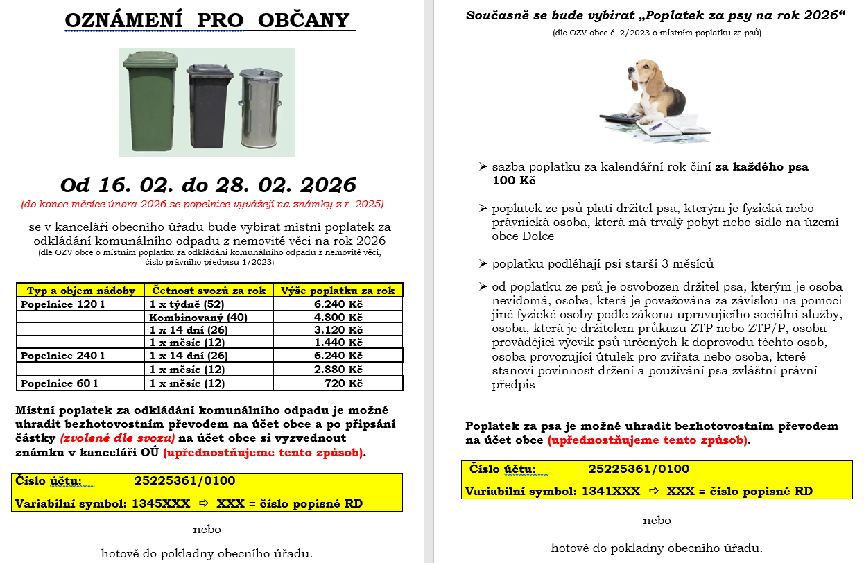 Místní poplatky na rok 2026 hrazené v hotovosti se budou vybírat od 16.2. do 28.2.2026 vždy v úřední dny (pondělí a středa).